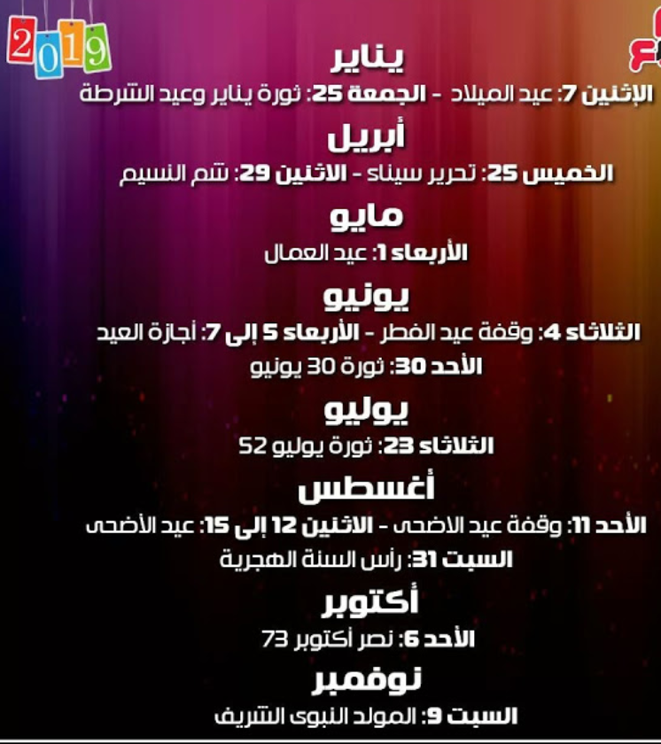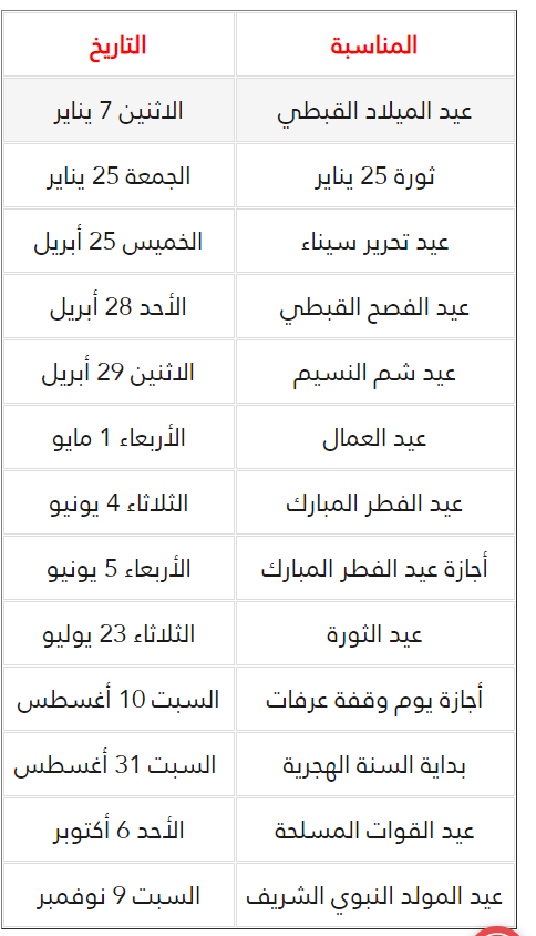 الاجازات الرسمية في مصر 2020