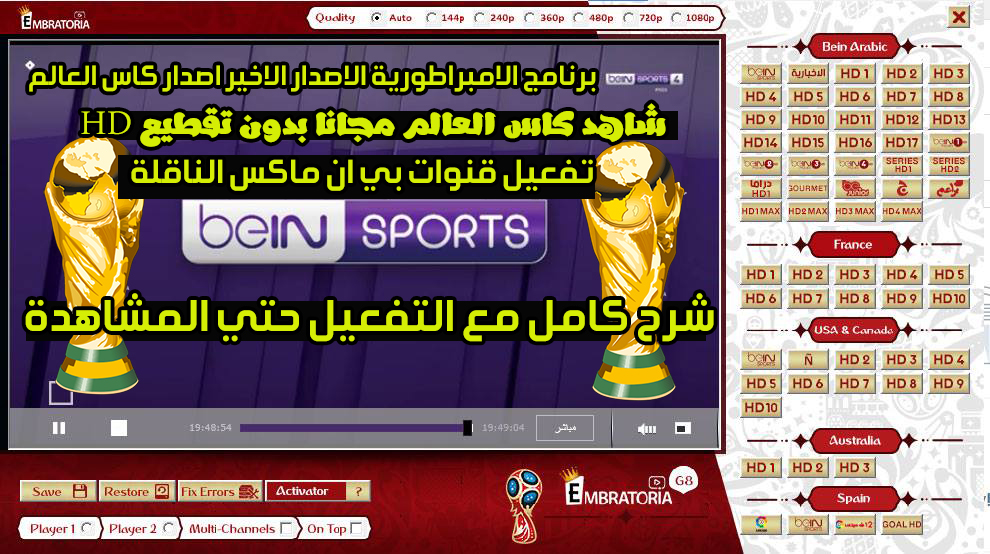 برنامج بين سبورتس يمكنك من متابعة مباريات المونديال 2018 فى روسيا مجانا فهو تطبيق تابع لمجموعة قنوات بي ان سبورت bein connect العالمية التي تبث مباريات كاس العالم فى روسيا يمكنك تحميله على هاتفك الاندرويد او الايفون ومتابعة. مشاهدة كاس العالم 2018 اون لاين بدون اعلانات تحميل برنامج مشاهدة كأس العالم روسيا 2018 koora cafe بث مباشر الامر الشاغل لتفكير معظم المستخدمين كيفية مشاهدة مباريات كأس العالم 2018 مجانا لذا قامت الشركة المصممة للتطبيق المميز. يمكنك هذا البرنامج من مشاهدة. مشاهدة طيبة نتمناها لكم.